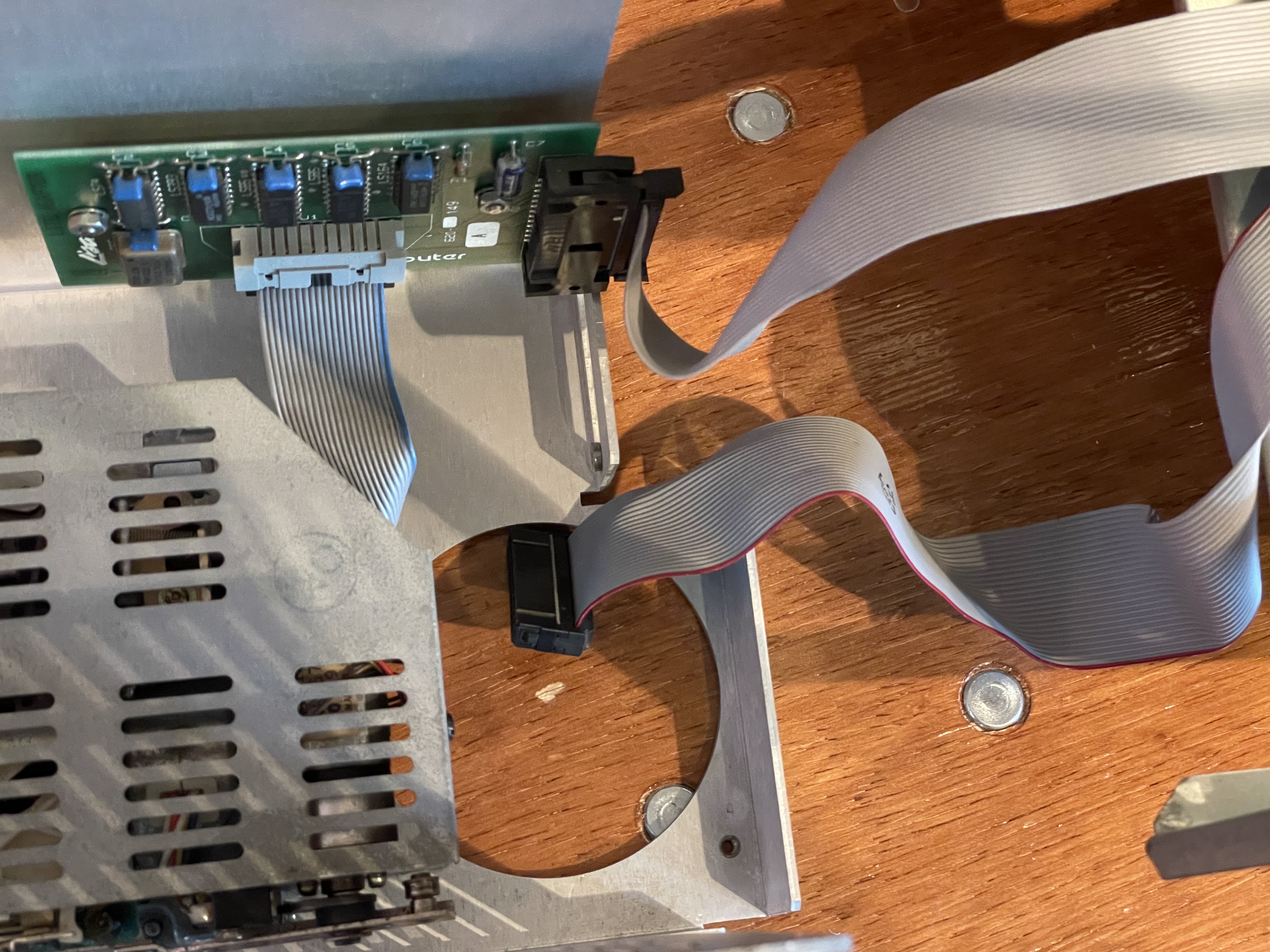 The background: A Lisa 2/5 (with parallel card) plus two 5MB Profiles that I bought on eBay. The seller was in the LA area, and since my daughter lives there, she picked it up and brought it over to me in Palo Alto. This saved a few $100s in S/H. This 2/5 looks like it's actually a converted Lisa 1, as evidenced by the Twiggy power cable and the two floppy ribbon cables (see pic)